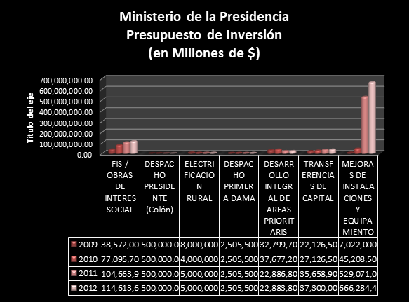 En el presupuesto de inversiones del Ministerio de la Presidencia, se asignan, en el 2012, más de 100 millones para obras de interés social y alrededor de 650 millones para el denominado programa Mejoras de Instalaciones y Equipamiento (presumiblemente para la compra de equipo militar para el servicio de protección institucional, uno de los componentes de la Fuerza Pública).