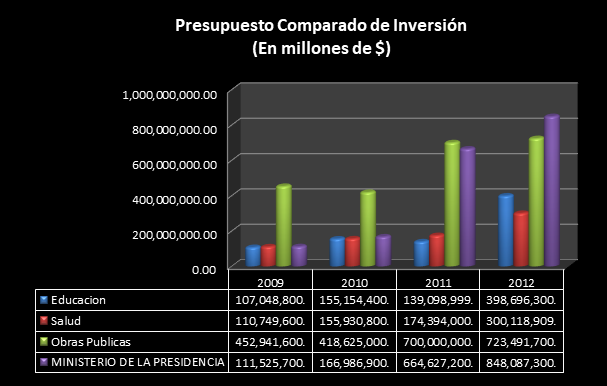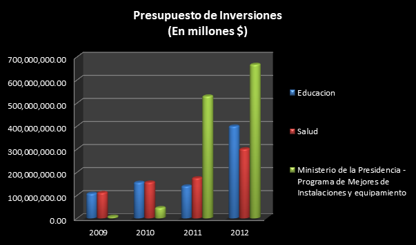 Es paradigmático que el presupuesto de inversiones aprobado para el 2012 para Salud (300.1 millones) y Educación (398.9 millones) son inferiores al de Obras Públicas (723.5 Millones) y el de la Presidencia (848.1 millones).