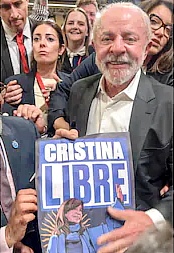El líder brasileño habló en el Foro en Defensa de la Democracia, en Barcelona, donde se mostró con un volante con la imagen de Cristina Fernández de Kirchner y la consigna “Cristina Libre”.