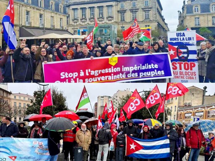 Convocados por el Partido Comunista Francés (PCF), ciudadanos de diversos sectores de la sociedad, entre ellos políticos, sindicalistas e integrantes de asociaciones con décadas de labor solidaria con Cuba, acudieron a sitios emblemáticos como la Plaza de la Victoria en Burdeos para denunciar el bloqueo que Washington impone a la isla y su recrudecimiento.